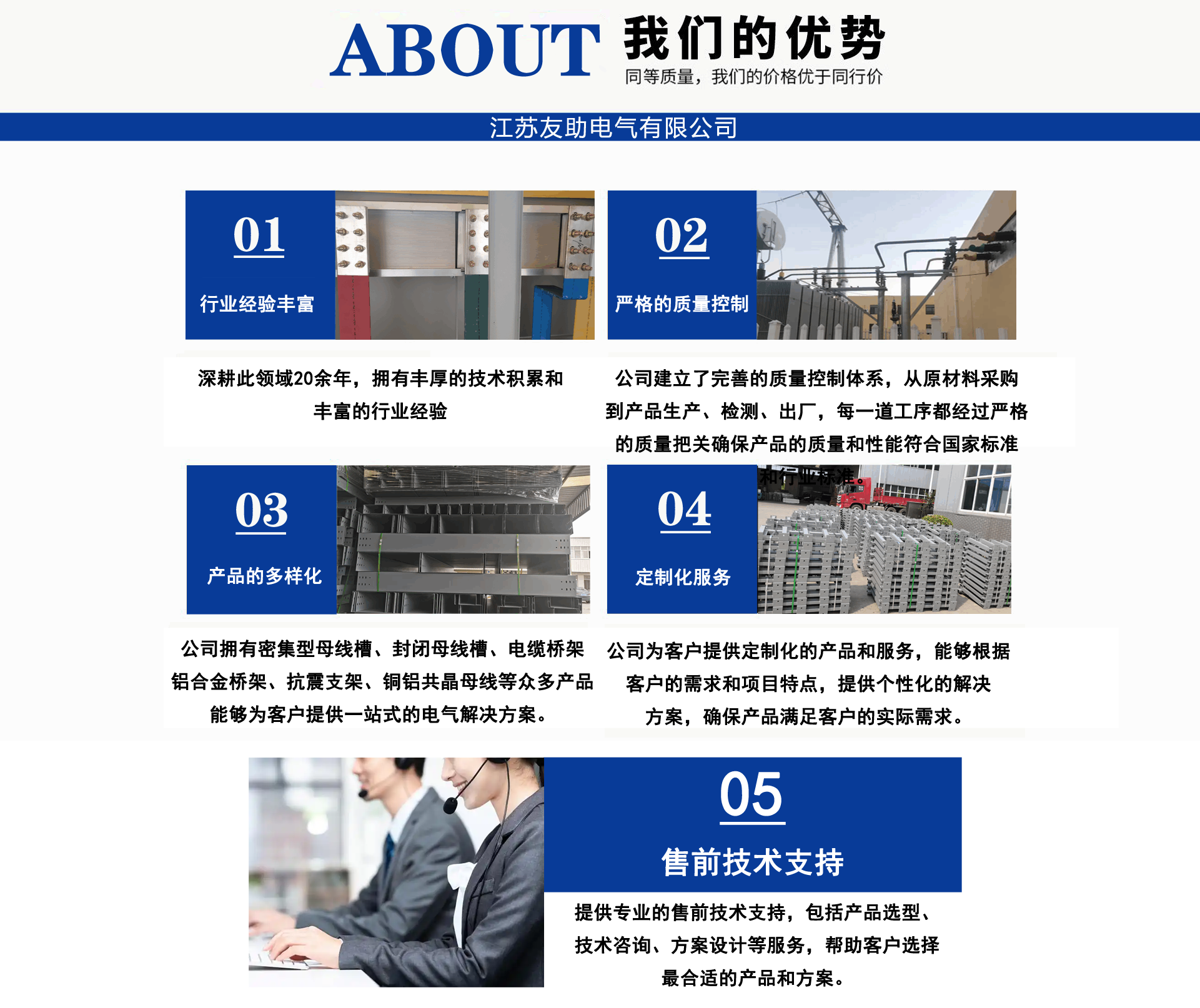 江蘇友助電氣有限公司地處中國工程電氣生產(chǎn)基地-一江蘇省揚中市。經(jīng)營范圍:電纜橋架,母線槽(橋),管型母線,銅軟連接(伸縮節(jié)),高低壓開關(guān)柜,配電箱,抗震支架產(chǎn)品系列。 公司宗旨:客戶至上。已成功為江蘇二十屆省運會會場-泰州體育館,南京寶龍商業(yè)綜合體,張家口百兆瓦風(fēng)電場,濟(jì)源市婦幼醫(yī)院,威海市未來科技園,湖北皇恩燁新材料科技有限公司,南京中央路小學(xué),南通中天大酒店,新疆新安特鋼有限公司,河北省送變電有限公司,南京南微醫(yī)學(xué)研發(fā)基地等多項工程配套服務(wù),我們愿與您精誠合作,互利共贏!公司技術(shù)人員深耕橋架,母線領(lǐng)域30年,為您提供橋架,母線槽疑難問題解決方案。母線槽不論每相是單排,雙排,三根排重疊,不管有多少個水平彎、垂直彎,轉(zhuǎn)接排在發(fā)貨前預(yù)裝一遍,確保尺寸無誤。到現(xiàn)場直接擰螺絲,效率高,橫平豎直,規(guī)規(guī)矩矩,符合標(biāo)準(zhǔn),供電局,業(yè)主,監(jiān)理,驗收易通過。供貨周期3-7天。為了讓尊貴客戶您,設(shè)備安全通電,高枕無憂。我們提供如下售前售中售后服務(wù): 售前:免費技術(shù)支持,咨詢。 售中:免費現(xiàn)場精確測繪、設(shè)計。 售后:安裝服務(wù),免費指導(dǎo)。 質(zhì)量是生命,客戶是源泉。承諾客戶的,一定全力做到。讓我們一起進(jìn)步!...